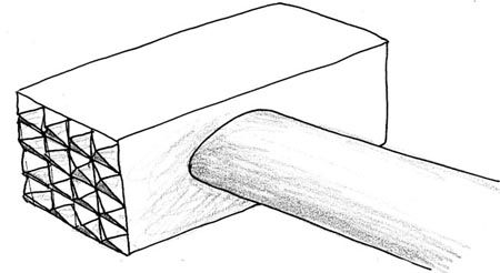 Prenez maintenant deux toiles émeri assez fines et collez-les l'un contre l'autre. Vous obtenez alors "de la toile émeri double face". Glissez la toile émeri entre ces deux faces irrégulières. Demandez à un camarade de vous aider en lui demandant de presser ces deux faces irrégulière l'une contre l'autre en le gardant bien face à face. Pendant ce temps vous allez poncer simultanément les deux faces de balsa en regard avec votre toile émeri double face. Qu'obtiendrez vous au résultat ? Les deux faces, qui ne se déplacent pas l'une par rapport à l'autre deviendront-elles planes ? Non, mais elles acquéreront la même irrégularité. En tout point la distance qui les sépare sera égale à l'épaisseur de votre émeri à double face. Quand le travail sera achevé, si vous enlevez cette toile les deux blocs seront parfaitement jointifs mais selon une surface non plane.