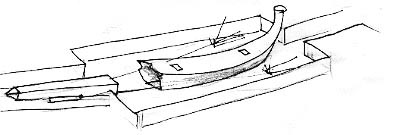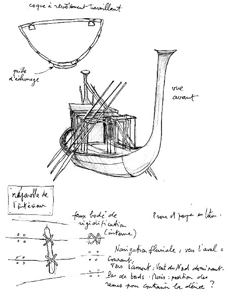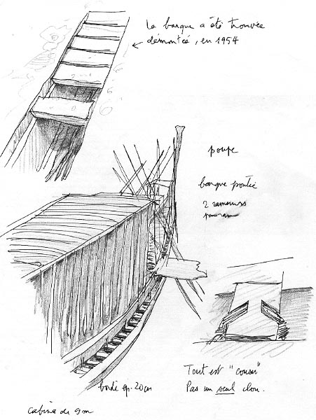 Voici les croquis que j'avais pris dans le "musée de la barque" que les Egyptiens ont bâti juste au pied de la pyramide de Khéops, là où l'ambarcation du pharaon fut découverte, en pièces détachées, dans une fosse recouverte par des dalles pesant chacune vingt tonnes.