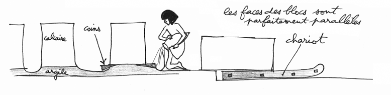 Ce système évoque un véritable travail à la chaîne avec des équipes spécialisées, les uns creusant les tranchées, les autres amenant les coins et l'eau et faisant sauter les blocs, d'autres assurant leur chargement sur des traîneaux de bois que les dernières équipes emmèneraient alors vers leur lieu d'implantation, en faisant glisser ces chariots sur des allées de calcaire, rendues glissantes en y répandant de l'argile humide. Une activité de fourmilière.