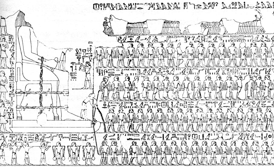 On distingue, en bas et à gauche, les porteurs amenant l'eau qu'un préposé déverse devant le chariot, doté de skis. Il existe au musée du Caire plusieurs statues de pierre montrant à la fois le dieu ou le pharaon et le traîneau sur lequel il est placé. Une simple règle de trois nous indique qu'il faut 2,86 hommes par tonne. Si on évalue à une tonne et demie la masse du "bloc moyen" de la pyramide de Khéops, on voit que celui-ci, en terrain plat ou sur une pente très faible peut être tiré par 4 hommes, qui développent chacun une force de traction de 17 kilos. C'est une autre paire de manche pour les plus gros blocs de la pyramide, ceux du plafond de la chambre sépulcrale, qui atteignent 70 tonnes et doivent être hissés à soixante dix mètres de de hauteur. Si les blocs sont montés par des haleurs, même sur des pentes très faibles il faut compter deux cent hommes qui, s'ils doivent se déployer sur une rampe auront besoin de place. La force de traction devra alors atteindre trois tonnes et demi.