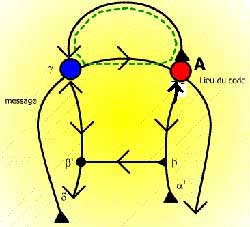 D'autre part nous étions arrivés à cette sorte de point de concours qui est situé ici et que nous appelons A, autrement dit l'Autre, en tant que lieu du code, lieu où parvient le message constitué par le mot d'esprit, par cette voie qui dans notre schéma peut être franchie à ce niveau-là, du message à l'Autre, et qui est la voie de la simple succession de la chaîne signifiante en tant que fondement de ce qui se produit au niveau du discours, c'est-à-dire par cette voie où, dans le texte de la phrase, se manifeste ce quelque chose d'essentiel qui émane, qui est ce que nous avons appelé le peu de sens. Cette homologation du peu de sens de la phrase, toujours plus ou moins manifeste dans le trait d'esprit, par l'Autre, c'est ce que nous avons indiqué la dernière fois, et sans nous y arrêter, nous contentant de dire que de l'Autre, ce qui est ici transmis, est relancé dans un double agissement qui retourne au niveau du message, ce qui homologue le message, ce qui constitue le trait d'esprit, ceci pour autant que l'Autre a reçu ce qui se présente comme un peu de sens, il le transforme en ce que nous avons appelé nous-mêmes d'une façon équivoque, ambiguë, le pas-de-sens.