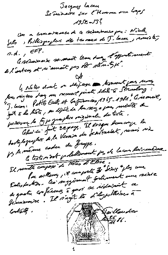 | Il n'existe pas de sténotypies des deux premiers séminaires de Lacan. Du premier, nous avons une trace écrite, "Notes sur le transfert", qui se trouve dans les Ecrits, du second, ces quelques notes prises par un ou plusieurs des participants à ce séminaire qui date de 1952 - 1953. | |