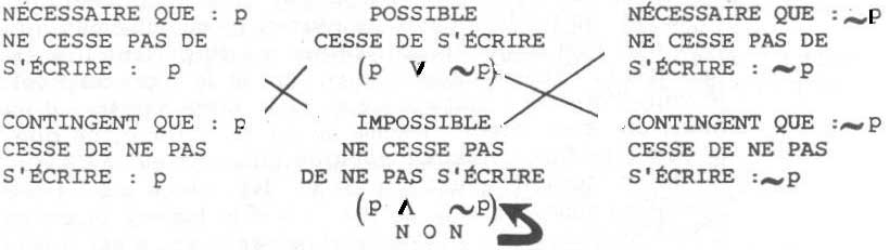 justement qu'on n'en vient jamais au bout. Et si je vous donne ce repérage, c'est que ça vous... faut que ça vous serve à quelque chose, faut que ça illustre ce que j'ai dit la dernière fois du dire vrai. Le dire vrai, c'est ce qui achoppe, c'est ce qui achoppe sur ceci que pour, dans un ou... ou intenable qui serait que tout ce qui n'est pas homme est femme et inversement, ce qui décide, ce qui fraye, n'est rien d'autre que ce dire, ce dire qui s'engouffre dans ce qu'il en est du trou par où manque au Réel ce qui pourrait s'inscrire du rapport sexuel. Alors, alors. Qu'est-ce qu'il en est du savoir ? Bien sûr, je ne suis pas arrivé à cette heure-ci, c'est-à-dire une heure vingt, ou quelque chose comme ça... c'est ça : vingt-quatre, je ne suis pas arrivé à cette heure-ci à même vous dire le quart de ce qu'il faut que je vous fasse passer dans les tripes, parce que c'est la fonction du dire, si je vous le dis pas, il ne suffira pas que je l'écrive, mais je vais quand même vous donner un petit échantillon de ce qui peut s'écrire, puisque sans cette réflexion sur l'écrit, sans ce qui fait que le dire ça vient à s'écrire, il n'y a pas moyen que je vous fasse sentir la dimension dont subsiste le savoir inconscient. Et ce qu'il faut que vous fassiez comme pas supplémentaire, c'est de vous apercevoir que si ce que je vous rends sensible en vous disant que l'inconscient ça ne découvre rien, puisqu'il n'y a rien à découvrir... Il n'y a rien à découvrir dans le Réel, puisque là il y a un trou. Si l'inconscient, là, invente, c'est d'autant plus précieux de vous apercevoir que dans la logique c'est la même chose, à savoir que si Aristote ne l'avait pas inventé son premier frayage, à savoir fait passer du dire dans ce concassage de l'être grâce à quoi il fait des syllogismes, bien sûr on avait fait des syllogismes avec lui, simplement on savait pas que c'étaient des syllogismes ! Pour s'en apercevoir, faut l'inventer, hein, pour voir où est le trou, faut voir le bord du Réel. Et comme nous sommes déjà bien avant, et que je suis pas arrivé à vous en dire le quart, ça sera tant pis, ça meublera, enfin, ce qui viendra ensuite. Il faut quand même que je vous fasse sentir la portée d'une certaine façon dont moi je fraie la logique modale. Le plus fort, hein, c'est que bien sûr, pour ce qui est de construire, pour ce qui est d'inventer... et voyez là tous les échos d'intuitionnisme qu'il vous plaira, si tant est que vous sachiez ce que c'est, je vous ai traduit un jour le nécessaire, hein, par : ce qui ne cesse pas de s'écrire. Bon. Sachez-le, il y a une trace dans Aristote, que la logique propositionnelle, hein comme on dit, à savoir que quelque chose est vrai ou faux, ce qui se note zéro ou un, selon les cas, il y a une petite trace, il y a un endroit où Aristote dérape, je vous montrerai ça quand vous voudrez, dans le periermneias, comme par hasard, c'est L'interprétation, pour ceux qui ne l'entravent pas : il y a un endroit où ça fuse que la logique propositionnelle est tout aussi modale que les autres. Il est vrai que... si c'est vrai que ça ne se situe que là où je vous le dis, c'est-à-dire là où la contradiction n'est en fin de compte qu'artifice, artifice de suppléance, mais qui n'en reste pas pour ça moins vrai, le vrai jouant là le rôle de quelque chose dont on part pour inventer les autres modes. C'est à savoir que "nécessaire que : p"... quelque vérité que ce soit, ne peut se traduire que par "que ça ne cesse pas de s'écrire". Chacun voit entre ce fait, ce fait que quelque chose ne cesse pas de s'écrire, entendez par là que ça se répète, que c'est toujours le même symptôme, que ça tombe toujours dans le même godant. Vous voyez bien qu'entre le "ne cesse pas de s'écrire : p" et le "ne cesse pas de s'écrire : non-p", nous sommes là dans l'artefact dont témoigne justement et qui témoigne en même temps de cette béance concernant la vérité et que l'ordre du possible est comme l'indique Aristote, connecté au nécessaire. Ce qui cesse de s'écrire, c'est : p ou non p. En ce sens, le possible témoigne de la faille de la vérité. A ceci près qu'il n'y a rien à en tirer. Il n'y a rien à en tirer et Aristote lui-même en témoigne. Il y témoigne de sa confusion à tout instant entre le possible et le contingent. Ce qu'écrit ici mon V vers le bas, car après tout, ce qui cesse de s'écrire peut aussi bien cesser de ne pas s'écrire, à savoir venir au jour comme vérité du truc. Il peut arriver que j'aime une femme comme un chacun d'entre vous, c'est ces sortes d'aventures dans lesquelles vous pouvez glisser, ça ne donne pourtant aucune assurance concernant l'identification sexuelle de la personne que j'aime pas plus que de la mienne. Seulement il y a quelque chose qui, entre toutes ces contingences, pourrait bien témoigner de la présence du Réel. Et ça c'est bien ce qui ne s'avance que du dire pour autant qu'il se supporte du principe de contradiction. Ce qui bien sûr, naturellement, n'est pas du dire courant de tous les jours, non seulement dans le dire courant de tous les jours, vous vous contredisez sans cesse, c'est-à-dire que vous ne faites aucune attention à ce principe de contradiction, mais il n'y a vraiment que la logique qui l'élève à la dignité d'un principe, et qui vous permette, non pas bien sûr d'assurer aucun Réel, mais de vous y retrouver dans ce qu'il pourrait être quand vous l'aurez inventé. Et c'est bien en quoi ce que j'ai marqué concernant l'impossible,