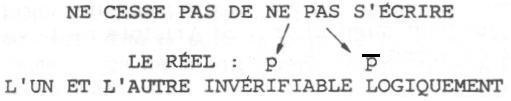 et. En d'autres termes, que ce soit à la fois p et non p, c'est impossible, c'est très précisément ce que vous rejetez au nom du principe de contradiction. C'est pourtant le Réel puisque c'est de là que je pars, à savoir que pour tout savoir, il faut qu'il y ait invention, que c'est ça qui se passe dans toute rencontre, dans toute rencontre première avec le rapport sexuel. La condition pour que ça passe au Réel, la logique, et c'est en ça qu'elle s'invente, et que la logique c'est le plus, le plus beau recours de ce qu'il en est du savoir inconscient. A savoir de ce avec quoi nous nous guidons dans le pot-au-noir. Ce que la logique est arrivée à élucubrer, c'est non pas de s'en tenir à ceci qu'entre p et non p, il faut choisir, et qu'à cheminer selon la veine du principe de contradiction, nous arriverons à en sortir quant au savoir. Ce qui est important, ce qui constitue le Réel, c'est que, par la logique, quelque chose se passe, qui démontre non pas qu'à la fois p et non p soient faux, mais que ni I'un ni I'autre ne puisse être vérifié logiquement d'aucune façon. C'est là le point, le point de re-départ, le point sur lequel la prochaine fois je reprendrai : cet impossible de part et d'autre, c'est là le Réel tel que nous le permet de le définir la logique et la logique ne nous permet de le définir que si nous sommes capables, cette réfutation de l'un et de l'autre, de l'inventer. |