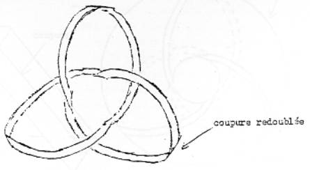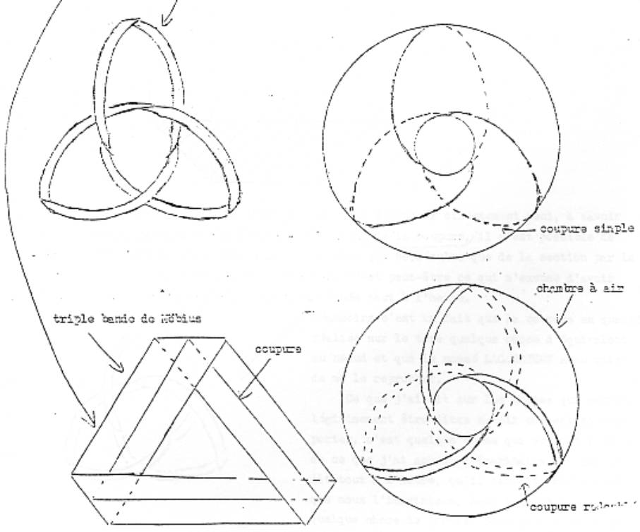 C’est la figure que j’ai indiquée là (trèfle à gauche), celle qui redouble la coupure, c’est la figure que j’ai indiquée là qui donne étoffe à ce nœud à trois : c’est quelque chose qui ne se produit que de la coupure par le milieu de ce que j’ai appelé la triple bande de Moebius : c’est à couper par le milieu (Moebius bas gauche) cette triple bande de Moebius que le nœud à trois apparaît, de sorte qu’après tout c’est ce qui m’excuse d’avoir énoncé ce fait, ce fait absurde.