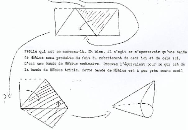 Je voudrais vous suggérer quelque chose qui a toute son importance, c’est ceci : c’est que comment, la bande de Moebius, la fait-on la plus courte ? En repliant ce triangle-là sur celui-ci. Il en résulte ceci, à savoir quelque chose se