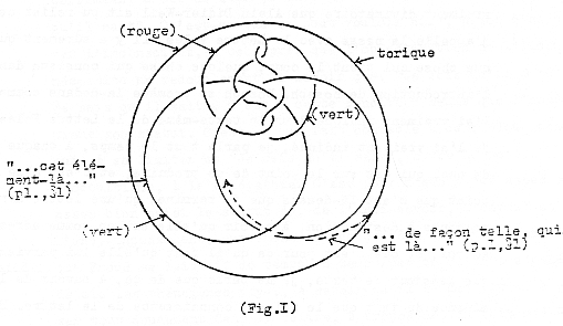 Ca n'est absolument pas tout simple, et le fait que j'ai dérangé plusieurs fois Pierre SOURY qui est quelqu'un dont j'ose croire que, mais, dont j'ose croire que je suis pour quelque chose dans le fait qu'il ait beaucoup donné dans le noeud borroméen, je lui ai posé le plus récemment la question de savoir comment quatre tétraèdres peuvent se nouer borroméennement entre eux. Il m'en a aussitôt donné la solution, solution que j'ai vérifiée pour être valable. C'est quelque chose qui implique ce que vous voyez là, à savoir non pas une relation entre ces termes qui soit sphérique, mais une relation que j'appellerai torique.