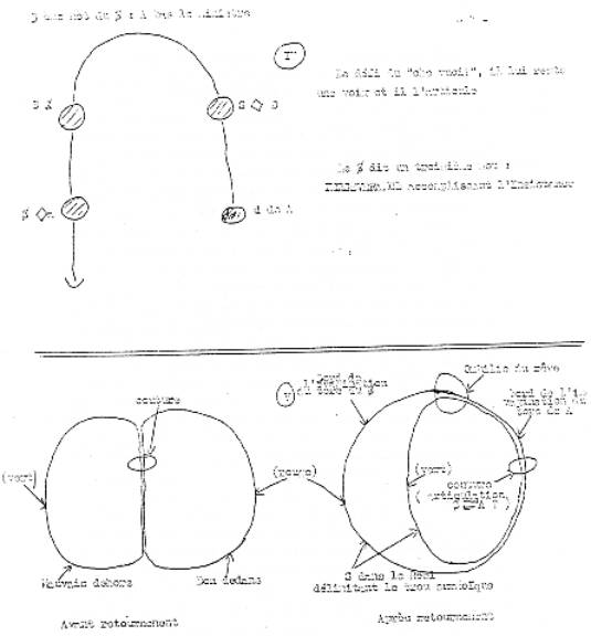 (p21->) Alors pour terminer - parce que c'est plus tard que je pensais - je voudrais maintenant essayer de ...là c'est des élucubrations, je dois dire que c'est quelque chose que j'aborde avec beaucoup d'humilité, mais il me semble qu'il n'est pas impossible de rendre compte avec les idées que nous apportées le notion de retournement de tore du séminaire de l'an dernier, de ces deux béances, de ces deux réels, il n'est peut-être pas impossible d'en rendre compte topologiquement. Je dois vous dire que cette possibilité effectivement qui m'est apparue l'an dernier avec l'aide de CANTARDO CALLIGARIS, je suis effectivement assez timide dans son maniement pour en parler de façon soutenue, mais enfin le docteur LACAN ne m'a pas complètement découragé de tenter de le faire, alors je vous soumets ce que ça va donner.