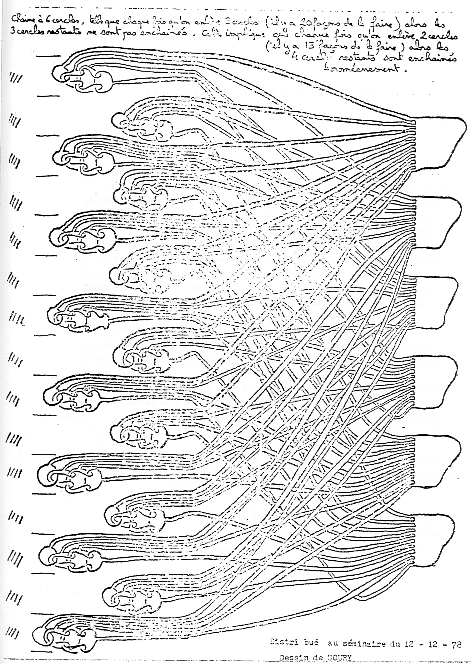 (p2->) J’ai poussé plus loin mon investigation, à savoir que j’ai interrogé sur un groupe de six cercles, j’ai questionné sur la façon dont on obtient un borroméen généralisé en en coupant trois. Il y a effectivement 35 façons de le faire. Pour cela, il faudrait, de la même façon que nous avons fait ces cinq cercles, en produire un sixième. Cette façon, je vous en dispense, car aussi bien çà serait un peu forcé. Mais il est possible de le construire. Parmi les 35 façons de couper les trois cercles en obtenant ce nœud que j’appelle borroméen parce qu’il est symbolisé à partir de trois, c’est-à-dire que les trois sont dénoués quand on retire un…il suffit d’en couper un pour que les trois autres soient dénoués.