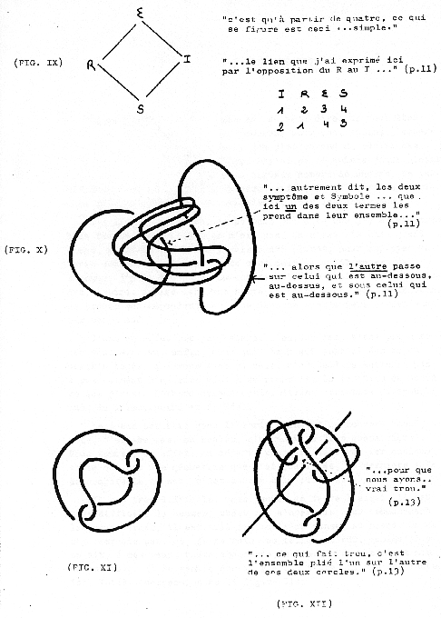 Si vous trouvez, quelque part, je l'ai déjà dessiné, ceci qui schématise le rapport de l'Imaginaire, du Symbolique et du Réel, en tant que séparé l'un de l'autre, vous avez déjà, dans mes précédentes figurations, mis à plat leur rapport, la possibilité de les lier par quoi ? par le sinthôme. Si j'avais ici une craie de couleur ( "De quelle couleur, vous la voulez ?" - "Rouge, si (p11->) vous le voulez bien. Vous êtes vraiment trop gentille. " ) Vous devez voir ceci : c'est que à rabattre ce grand S, c'est-à-dire ce qui s'affirme la consistance du Symbolique, à le rabattre d'une façon qui se trace ainsi, vous avez - cette figure, est correcte - je veux dire que glissant sous le Réel, c'est évidemment aussi sous l'Imaginaire qu'il doit ( ou va ? ) passer, vous vous trouvez dans la position suivante : c'est à savoir que vous aurez le rapport suivant, ici par exemple, l'Imaginaire, le Réel et le Symptôme que je fais figurer d'un sigma, et le symbolique, et que chacun d'entre eux est échangeable expressément, que un à deux peut s'invertir en deux à un, que trois à quatre peut s'invertire de quatre à trois d'une façon qui, j'espère, vous paraît simple. Mais nous trouvons, de ce fait, dans la situation suivante, c'est que ce qui est un à deux, voire deux à un, pour avoir dans son milieu, si l'on peut dire, le sigma et le S , doit faire, et c'est précisément ici que c'est figuré, doit faire que le symptôme et le Symbole se trouvent pris d'une façon telle, il faudrait que je vous montre par quelque figuration simple, d'une façon telle que il y en a, comme vous le voyez là-bas, qu'il y en a quatre qui sont, vous le voyez là, il y en a quatre qui sont tirés par le grand R, et ici, c'est d'une certaine façon que le I se combine, en passant au-dessus du Symbole, ici figuré, et au-dessous du symptôme. C'est toujours sous cette forme que se présente le lien, le lien que j'ai exprimé ici ( Fig. IX ) par l'opposition du R au I, autrement dit, les deux symptôme(s) et le Symbole se présentent de façon telle que, ici ( Fig. X ) ; un des deux termes les prend dans leur ensemble, alors que l'autre passe disons, sur celui qui est au-dessous, au-dessus et sous celui qui est au-dessous. C'est la figure que vous obtenez régulièrement dans une tentative de faire le noeud borroméen à quatre et c'est celle que j'ai mis ici, sur l'extrême droite. ( Fig. VIII )