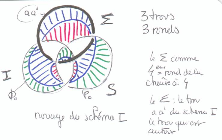 | les solutions : -passer de la fable Freudienne à la structure du sujet -au lieu de combler les trous du schéma I, les nouer. Introduire le Réel dans le discours et le nouer au schéma I -la psychose ça se répare pas ! on ne peut pas reconquérir ce qui est aboli , ça se traverse, ça s'élabore -jouir du déchiffrage et d'un gai savoir -la psychanalyse comme (nouvel) érotisme lettré !érotologie (de passage)! -Une jouissance sans culpabilité,sans souffrance, une pratique de la satisfaction sans représentation. -faire de la logique, faire un comptage chiffré du Noeud , le Noeud et son histoire étant introduits comme arguments discursifs (entre ratage et coinçage !) -Introduire le S comme 4eme rond dans la chaîne à 4 -le Noeud Bo représente l'Être vide de sa jouissance jusqu'à n'en laisser que la corde. Ossature, ombre de l'ossature ! Jouissance sans souffrance, sans surface, sans représentation, car le noeud n'existe pas à la ficelle, mais autour de la ficelle. Détachement ! -l'analyse entre éthique ? esthétique ? et érotologie de passage ?