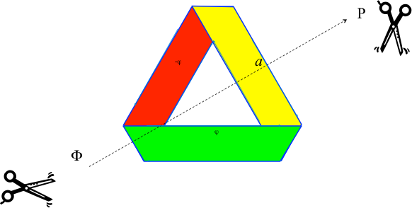 Le bord unique et de sens contradictoire de la bande de Mœbius dans sa lecture du point de vue global : le dessus, c’est le dessous. L’opérateur de la division ( / ), premier coup de ciseau, voilà le Nom-du-Père, P (éventuellement : paternité). L’opérateur ( / ) de la division phallique, second coup de ciseau contradictoire, -ϕ/ϕ, nous le nommerons le phallus symbolique, Φ (éventuellement : masculinité). La contradiction de sens coups de ciseaux empêche que l’une et l’autre des divisions tombe juste.