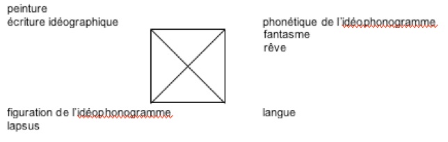 Dans l’ordre du forcing analogique, ramener la figure du sinogramme à l’imaginaire et le son au symbolique, et de là, respectivement, aux dites représentations de chose et représentation de mot, me semble excessif. D’une part, parce que la traduction française des termes Wort- et Sachvorstellung laisse à désirer : ici pas de s de composition des mots (comme dans Vorstellunsrepräsentanz), donc rien qui in… au génitif (le de français), et donc, selon les habitudes de traduction mal conçues lorsqu’elles se juxtaposent au mépris de la langue : représentant-représentation, comme disent Laplanche et Pontalis, mais qui peuvent se défendre lorsqu’on choisit l’opposition : représentation-mot ou représentation-chose (comme on dit « représentation-but » pour Zielvorstellung) au sens de représentation en tant que mot ou passant par le mot, ayant consistance de mot, et représentation en tant que chose (Sache : un truc, pas un objet matériel, et donc plus vague que l’objet tangible, comme on parle de la loi ┬ ou de la loi ┴ en mathématiques : loi truc et loi anti-truc). D’autre part, parce que Lacan pointe, à mon avis à juste titre, la représentation comme mot au niveau de l’écrit. Le mot écrit (la figuration par lettrage) a valeur de représentation, à mon sens, réelle. Cela ne cadre pas avec les analogies de Huo Datong.