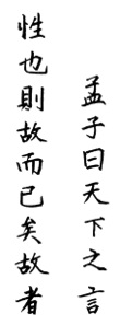 Diese zweispaltige Formel [menue formule] findet sich, wenngleich sie etwa 250 vor Christus und, wie Sie sehen, in China geschrieben wurde, im 2. Kapitel des IV. Buches, zweiter Teil – was gelegentlich anders, dann als Teil VIII im IV. Buch, zweiter Teil, Abschnitt 26 klassifiziert wird – des Meng-tzu, den die Jesuiten Mencius3 nennen, waren sie doch weit vor der Zeit, in der Sinologen aufkamen, d. h. zu Beginn des XIX. Jahrhunderts, nicht früher, dort vor Ort.