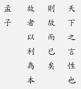 Und dieser Diskus über die Natur yen hsing 言性 hat Auswirkungen. Er bewirkt, dass es Profit li 利, Mehr-Genießen, gibt. Mithin wird sich aufgrund i 以 dieses Mehr-Genießens li 利 das ursprünglich Gegebene ku 故 verwurzeln tse 者, sich abstützen wei pen 爲本.