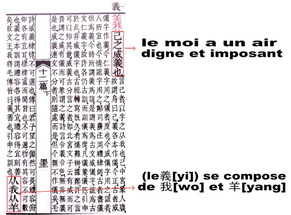 En effet, selon la théorie de l’écriture chinoise, au début, 義 yì a une seule signification « le moi qui est beau, bon, bien et idéal ». Petit à petit, il signifie au moins deux significations :