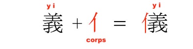 Pourquoi ? Un spécialiste de l’écriture chinoise explique qu’au début, dans les textes anciens (peut-être jusqu’à la dynastie de Han), 義 yì désignait vraiment le sens « avoir un air digne et imposant ». Mais depuis, 儀 yí désigne la même chose. Donc, 義 yì fut progressivement remplacé par le 儀 yí dans la transcription des textes anciens 4.