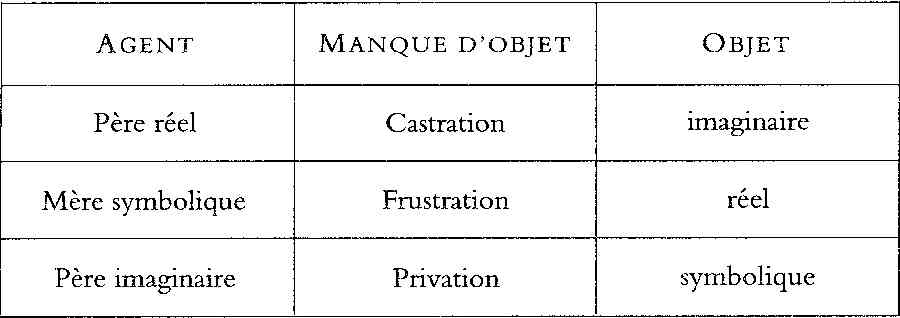 25. On donne ici le tableau élaboré dans La relation d’objet notamment dans les séances du 13 mars (p. 215) et du 3 avril 1957 (p. 269). Paris, Seuil 1993.