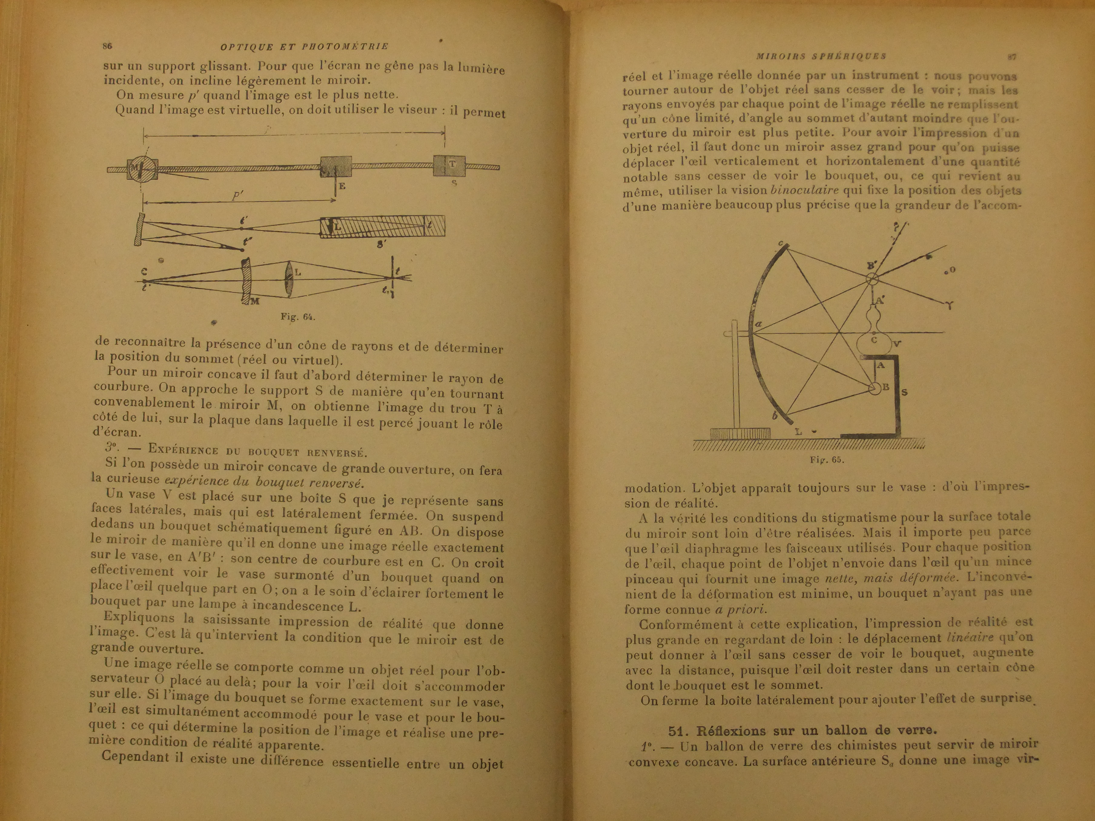réelle. Dans certaines conditions, comme celles d’une de ces expériences qui n’avaient de prix que d’un intérêt encore innocent pour la maitrise du phénoméne, reléguées qu’elles sont maintenant au rang de la physique amusante, cette image peut être fixée par l’oeil dans sa réalité, sans le médium ordinairement employé d’un écran. C’est le cas de l’illusion dite du bouquet renversé, qu’on trouvera décrite, pour lui donner une référence sérieuse, dans l’« optique et photométrie dites géométriques » (revoilà notre géométrie), de Bouasse, figure au reste curieuse de l’histoire de l’enseignement, et ouvrage à consulter à la page 86, pour notre objet, restant aux autres des gadgets qui, pour être moins futiles, seraient aussi propices a la pensée (4e .d. Delagrave, 1947). Voici l’image reproduite de la page 87, dont pour tout commentaire nous dirons que le bouquet réel caché dans la boite S, « pour ajouter, comme écrit Bouasse, à l’effet de surprise », apparait surgir pour l’oeil accommodé sur le vase V qui surmonte la boite, précisément de l’encolure A’ du dit vase où l’image B’ se réalise nette, malgré quelque déformation que la forme non régulière de l’objet doit rendre fort tolérable.