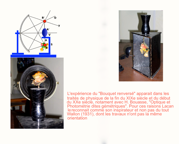 L’exploitation que Lacan fait de cette expérience physique du « bouquet renversé » pour qualifier ce qu’il nomme « Le stade du miroir », s’origine de Lacan, elle était inédite en son temps (1936)