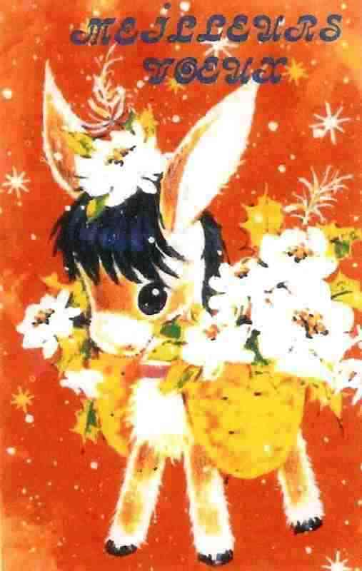 Elle représentait un âne portant 2 paniers de fleurs. D’une écriture bien déliée il avait mis ce mot à mon intention :