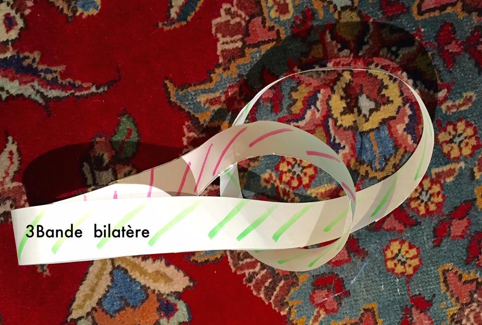 1 ) Soit une bande de Moebius, en la coupant par le milieu, au terme de son premier bouclage on obtient une bande bilatère avec un envers et un endroit :