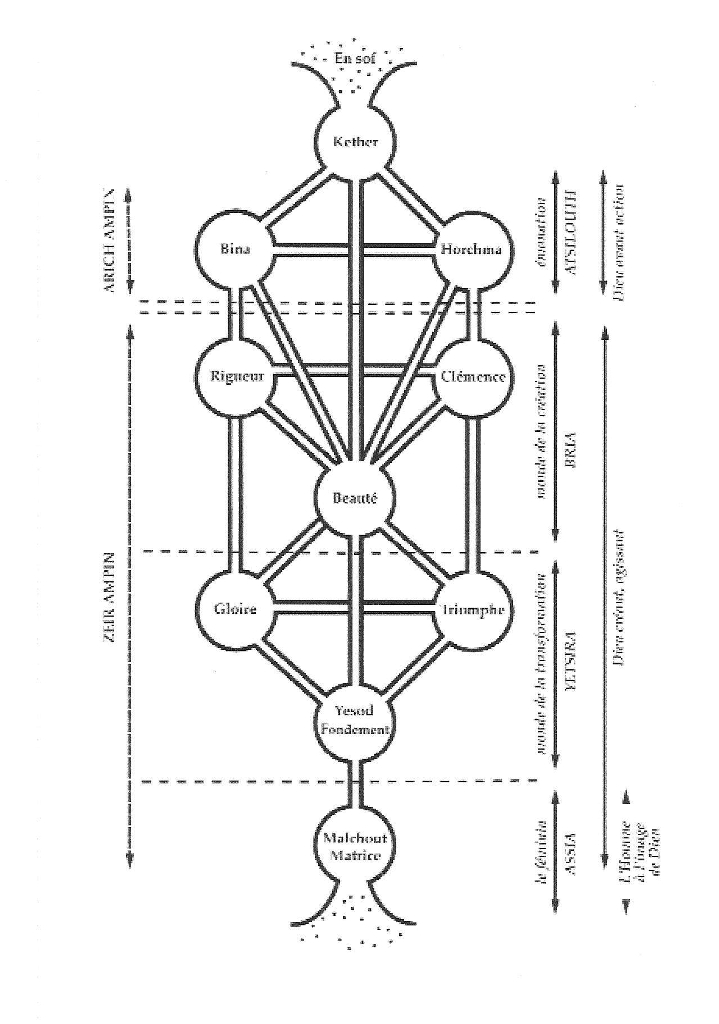 Arich Ampin, monde situant le non-être de Dieu, avec en sommet “En Sof”, “En” ou Aïn signifiant potentiel non manifesté, c’est-à-dire “non-être” et Sof est le sans fin, l’infinitude, Réel indicible, impensable, soit Dieu pensé par Dieu, qui est un Réel paradigmatique informulable, impensable pour les petits hommes. Et en bas, ce qui concerne la création : Ce qui est là, c’est Assia le domaine de Malchout la matrice, la grande et la petite Mère, comme pourvoyeuse des hommes à l’image de Dieu : autre domaine du Réel.