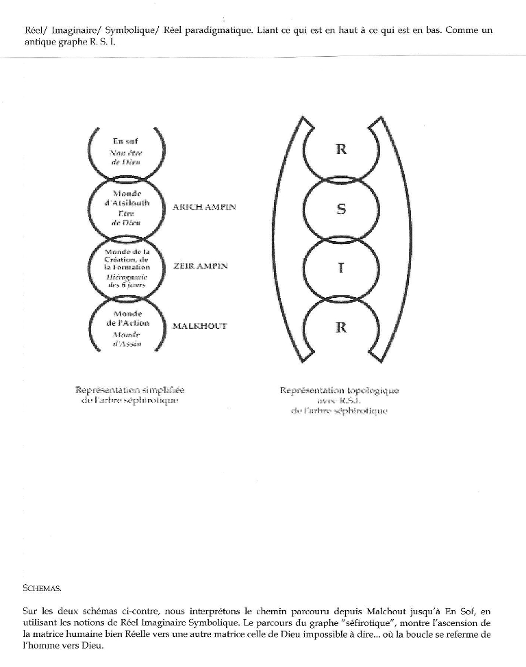 Sur les deux schémas ci-contre, nous interprétons le chemin parcouru depuis Malchout jusqu’à En Sof, en utilisant les notions de Réel Imaginaire Symbolique. Le parcours du graphe “séfirotique”, montre l’ascension de la matrice humaine bien Réelle vers une autre matrice celle de Dieu impossible à dire… où la boucle se referme de l’homme vers Dieu.