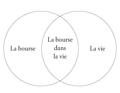 Pour représenter ce vel, Lacan utilise les cercles d’Euler et une opération de la logique symbolique, la réunion. Le schéma no 1 montre que, si je choisis l’ensemble « bourse », je perds tout. Mais si je choisis l’ensemble « vie », il subsiste le cercle, qui contient les éléments de la vie, amputé de la demi-lune centrale où se trouvent les éléments communs aux deux ensembles, la part de ma bourse dans ma vie. En résumé, et c’est ce qui définira ce vel, quel que soit le choix qui s’opère, la conséquence sera de l’ordre d’un ni l’un, ni l’autre. Reste donc à savoir, puisque l’autre partie disparaîtra inévitablement, sur laquelle portera le choix.