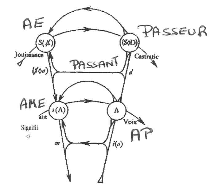 29 — La fonction 0 du signifiant perdu, à quoi le sujet sacrifie son phallus, la forme 0(barré) (a) du désir mâle ; Grand A barré (phallus) du désir de la femme nous mènent à cette fin de l’analyse dont Freud nous a légué dans la castration l’appris, (idem. P.683).