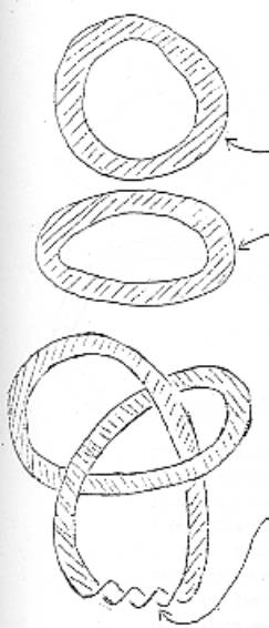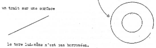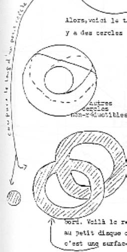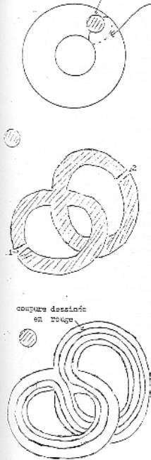Pour le moment déjà, ça fait une différence entre trouage et coupure. Alors, voici ici le résultat du trouage, il n’y a qu’une façon de trouer, alors que des façon de couper, il y en a autant qu’il y a de cercles sur le tore. Alors voilà le résultat du trouage, voilà le résultat de la coupure. (p 4 et 5) Ici le résultat du trouage, c’est une surface avec bord qui n’a qu’un seul ; le résultat de la coupure, ce sont des surfaces à deux bords, mais c’est une surface spécialement simple, puisque c’est une bande. Ca, c’est déjà une façon de montrer la différence entre nouage et coupure : c’est que le tore noué et le tore coupé, ce n’est pas la même chose.