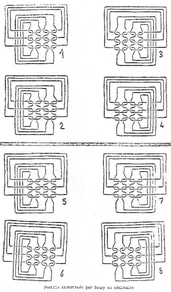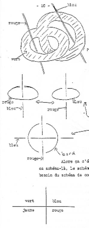 (p3->) Autrement dit ce qui s’appelle ici (sur tableau de Soury de la page précédente carrefour de bande – on dit carrefour de bande- se réfère au tore troué. Ici aussi le retournement dont il s’agit est un retournement torique, c’est-à-dire du fait d’un trou. Je vais donner la parole maintenant à Soury qui se retrouvera en posture de défendre sa position.