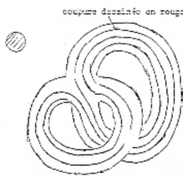 il reste une bande plus ou moins nouée et plus ou moins tordue. Alors je vais dessiner ce qui reste par une coupure méridienne. Par une coupure méridienne, il reste une bande qui n’est ni nouée, ni tordue. Par une coupure longitudinale aussi, il reste la même chose : une bande qui n’est ni nouée, ni tordue. Et ça aussi ce sont des surfaces avec bord. Mais il y a quand même une différence : c’est que là c’était une surface avec un seul bord et ici ce sont des surfaces avec deux bords. Si la coupure est faite le long d’un cercle pas si simple, pas si simple que le cercle méridien ou que le cercle longitude, alors ce qui reste c’est une bande, il reste encore une bande, mais qui est plus ou moins nouée, plus ou moins tordue. Alors par exemple, enfin pour un certain cercle, on obtient une bande qui est nouée en trèfle et qui est tordue. Alors la torsion, je ne me rappelle pas la torsion correspondante, donc je dessine, j’ai toute chances de faire une erreur là, c’est-à-dire que ce n’est pas n’importe qu’elle torsion, mais je ne me rappelle plus qu’elle torsion il y a.