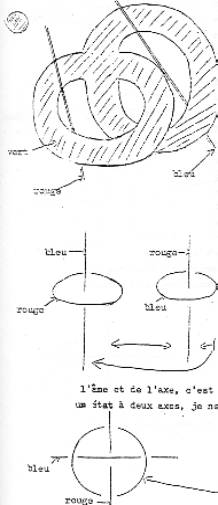 C’est qu’ici j’avais dessiné antérieurement une bande qui n’était pas nouée et qui était tordue, alors là on voit les deux faces, c’est-à-dire qu’à l’occasion de la torsion on voit l’autre face, c’est-à-dire, que dans cette partie-là, on voit du jaune, il y a du jaune et du vert. Enfin ça c’est pour montrer que dans un dessin de surface avec bord, les deux faces peuvent apparaître. C’est le hasard de certains dessins qui font qu’on voit toujours la même face. Alors ici donc, voilà les deux axes anciennement intérieur et extérieur et le tore coupé : cette bande. Eh bien, je ne sais pas si c’est imaginable que là-dedans le couple du jaune et du vert est devenu indépendant du couple du bleu et du rouge, c’est-à-dire que cette bande, tout ceci ce n’est qu’une bande on peut lui donner un demi-tour tout le long et ça sera toujours le même objet et la face jaune joue le même rôle que la face verte. Alors dans cette situation-là du tore coupé avec ses deux axes, le couple des deux faces verte et jaune et le couple intérieur/extérieur, bleu et rouge sont devenus indépendant. Ce qui indique quelque chose sur la différence des deux retournements, c’est que, dans le retournement par trouage on échange l’intérieur et l’extérieur, on échange les deux faces et ils s’échangent ensemble, c’est-à-dire qu’au moment ou ça échange le couple intérieur/extérieur, ça échange les deux faces, c’est à dire si ce tore coloré en jaune et vert quand on le retourne, s’il était d’extérieur vert, après il sera d’extérieur jaune. Dans le retournement par trouage, on inverse simultanément les deux faces et l’intérieur extérieur. Au contraire, le retournement par coupure permet de dissocier cette liaison, c’est-à-dire que, une fois le tore coupé, on peut le refermer, non pas…, je vais le dire autrement : c’est qu’au lieu de voir le tore troué ou le tore coupé comme un intermédiaire je vais le décrire différemment, c’est que le tore troué peut être refermé de deux façons