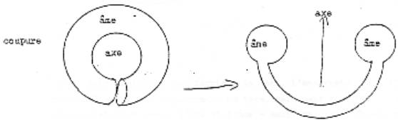 en permettant de le retourner comme ceci, substitue également l’âme et l’axe : ici le tore ayant ce qu’on appelle son âme et ici, du fait de la coupure, ce qui était d’abord l’âme du tore – voilà la coupure- devenant son axe. Il ma semble, quant à moi, que les deux cas sont homogènes. Néanmoins le fait que Soury distingue ce retournement par coupure du retournement par trou m’impressionne, à savoir que je fais grande confiance à Soury.