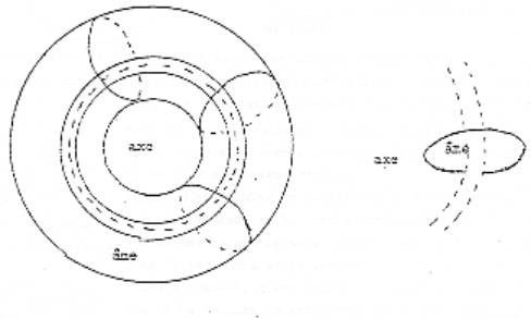 comme on peut le voir ici, il est capable de se retourner, c’est-à-dire que pour dessiner les choses comme cela, il se retourne à l’envers et qu’il en résulte que ce dans quoi on entre, à savoir ce que j’appellerai âme du tore devient l’axe, à savoir que le résultat de ce retournement est quelque chose qui se présente comme ceci en coupe, à savoir que l’âme du tore en devient l’axe. En d’autres termes, ceci vient se fermer ici et ce dont il s’agit dans le tore devient l’axe, à savoir que l’âme est formée de redéploiement du trou. Au contraire, le retournement par coupure qui a pour effet aussi de transformer le tore en permettant –voici la coupe-