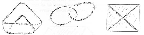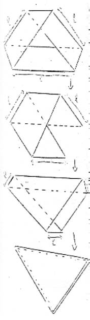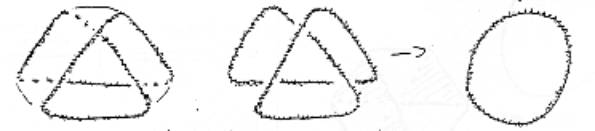 représentation comme ici tu as toujours un trou qui est virtuel, qui est ici un point par lequel tu peux passer une aiguille, une épingle, et qui disparaît dans cette représentation (Schéma p.7) où tu as les trois qui se recouvrent absolument et qui est la forme en fait la plus réduite possible d'une bande de Moébius avec une seule demi-torsion et qui est une représentation qui est beaucoup plus réduite que celle-ci parce que tu élimines en fait cet effet d'hexagone, qui est un effet artificiel si on peut dire, qui n'a pas de raison d'être particulière. Sa seule raison d'être de forme de la bande de Moebius a une seule demi torsion, c'est en fait la forme triangulaire et c'est celle-là. Et cette forme là, tu ne peux pas l'obtenir avec la seconde bande de Moebius qui est la bande de Moebius à trois torsions où là l'existence de ce trou virtuel central est absolument obligatoire. Ca se fabrique très bien, ça d'ailleurs, avec une bande de papier.... | |