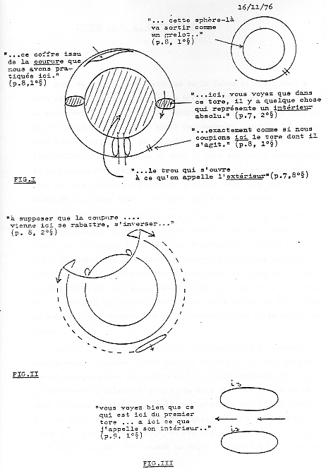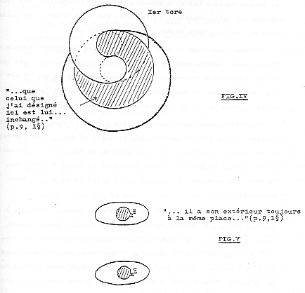 Ce ne semble pas ravir, si je puis dire, votre consentement. C'est pourtant tout à fait sensible, il suffit de faire un essai. Vous avez ici deux, deux tores dont l'un représente ce qui est advenu, alors que l'autre est original. Si vous, sur un de ces tores (Fig.IV ), sur un de ces tores couplé de la même façon, - (p9->) ceci va nous conduire à autre chose -, sur un de ces tores couplés, vous pratiquez la manipulation que je vous ai expliquée ici (Fig -I) à savoir que vous y fassiez une coupure, vous obtiendrez ce quelque chose qui se traduit par ceci, à savoir que les tores étant couplés vous avez à l'intérieur d'un de ces tores un autre tore, un tore qui est de la même espèce que celui que j'ai dessiné ici (Fig-I); ce qui désigne, désigne ceci, c'est que ici (Fig. II), vous voyez bien que ce qui est du premier tore, que ce qui est du premier tore a ici (Fig. III ), ce que j'appelle son intérieur, quelque chose dans le tore s'est retourné, qui est exactement en continuité avec ce qui reste d'intérieur dans ce premier tore, ce tore s'est retourné en ce sens que, désormais, son intérieur est ce qui passe à l'extérieur; alors que pour désigner celui-ci (Fig.IV) comme étant celui autour duquel se retourne celui qui est ici, nous nous apercevons que celui que j'ai désigné ici est, lui, resté inchangé, c'est-à-dire qu'il a son premier extérieur, son extérieur tel qu'il se pose dans la boucle, il a son extérieur toujours à la même place. Il y a donc eu de l'un d'entre eux retournement.