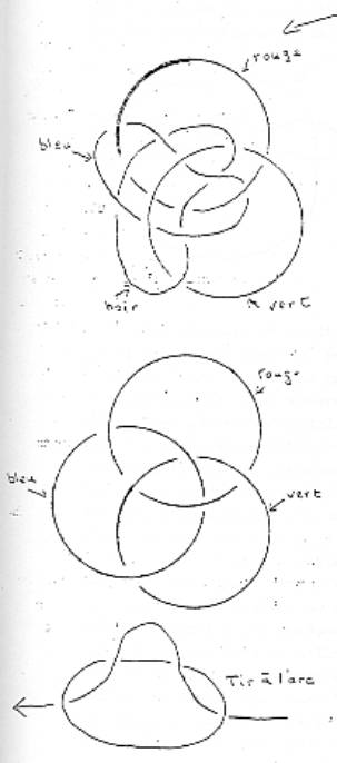 Mais ce que je voudrais essayer de dire, c’est qu’il y a un saut, parce qu’on a déjà commencé à faire marcher une autre machine, quand on abandonne un certain type de machine. Et il ne faut pas chercher à les pousser à l’extrême, c’est-à- (p14->) dire à l’extrême, c’est-à-dire nulle part. Par exemple, je vais vous le montrer sur cette figure, il y a déjà le dessin là des bords et je peux m’intéresser aux bords. Or qu’est-ce que ces bords vont me donner ? Eh bien, je vois ici qu’il y a un trou. Or le trou, si on raisonne sur le trou, le bord du trou, on imagine très bien qu’il est indépendant, tout à fait indépendant des autres bords qui sont sur cette surface, parce qu’on voit bien ici qu’il est indépendant de la partie bleue et l’autre bord rouge extérieur. Ici on voit bien que le bord de ce trou noir est tout à fait indépendant (III page précédente) Cette petite pastille, elle n’est pas nouée. Par conséquent, je peux par contre dessiner la partie bleue et la partie rouge : la partie bleue, ça va être un huit intérieur sur lequel vient se nouer en rouge une consistance ; la partie bleue, c’est le bord de la bande de Moebius qui est tracée sur la bande de Moebius et le bord du trou, c’est un rond noir.