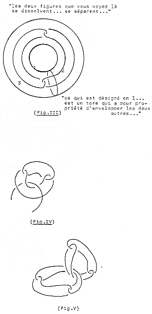 Néanmoins, j’objecte à SOURY ceci qui n’est pas moins vrai, c’est à savoir qu’en retournant n’importe lequel de ce qui s’appelle nœud borroméen (Fig.3), on obtient la figure suivante, le deux et le trois étant indifférents, c’est de retourner ce que j’ai désigné ici comme 1, à savoir un des éléments du nœud borroméen, dont vous savez comment il se dessine (Fig.4) ; dans la figure qui est à droite, celle-ci ; il est tout à fait clair que les ronds de ficelle qui sont à l’intérieur, à l’intérieur du tore, et qui d’une façon équivalente à ce que j’ai dit tout à l’heure, peuvent être figurés comme tores (fig.3), ce que je fais actuellement, chacun de ces tores retournés enveloppe les deux autres tores, de même ce qui est désigné en 1, ici, (Fig.3), est un tore qui a pour propriété d’envelopper les deux autres, à condition que chacun de ces tores soit retourné.