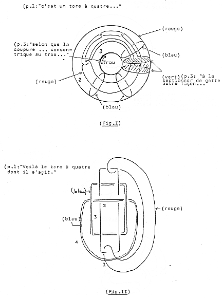 Je vais vous indiquer sue la figure de gauche (Fig.1) ceci qui est patent, c’est que à sectionner le tore retourné de la façon que je viens de faire, le nœud borroméen se défait. Par contre, à le sectionner de cette autre façon, dont il est, je le suppose, pour vous tous, évident que c’est l’équivalent à ce que je dessine ici, que c’est équivalent le nœud borroméen ne se dissout pas, alors que dans le cas présent, la coupure que je viens de faire, ici, dissout le nœud borroméen.