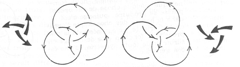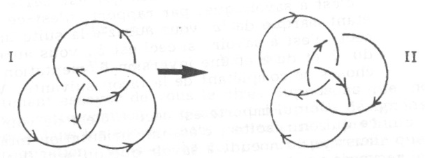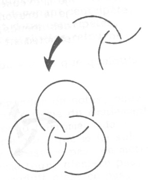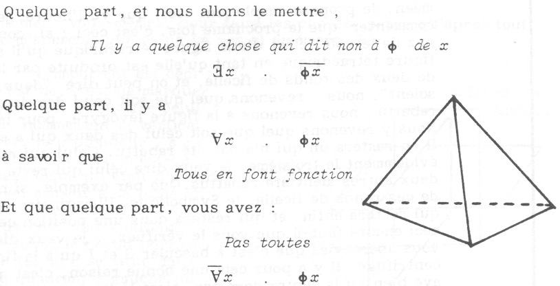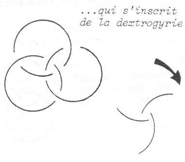 En d'autres termes , c'est aux quatre points d'opposition , c'est-à-dire sur les huit quadrants à quatre quadrants définissables par si je puis dire 1'inscription dans le cube d'un tétraèdre , c'est à cela que nous allons voir apparaître les quatre figures homogènes, toutes les trois, dans l'occasion, lévogyre, puisque nous sommes partis d'un lévogyre. Bon . Qu'en résulte-t-il ? Comment considérer cette multiplication, si je puis dire, par quatre, de ce qui résulte de simplement la mise à plat, ou l'écriture du noeud borro-(p161->)méen. Je propose simplement ceci, que vu l'heure, je n'aurai à commenter que la prochaine fois, c'est ceci : si, comme vous venez de le voir, c'est d'une figure tétraédrique qu'il s'agit, une figure tétraédrique en tant qu'elle est produite par la bascule de deux des ronds de ficelle, et on peut dire "deux, quels qu'ils soient", nous revenons, quel que soit celui des deux qui a été rabattu, nous revenons à la figure lévogyre, pour la spécifier. Nous y revenons quel que soit celui des deux qui a été rabattu. I1 en restera un qui n'a pas été rabattu. Celui qui reste est évidemment le troisième, je veux dire celui qui reste après que deux autres aient été rabattus. Que par exemple, si nous faisons de ces ronds de ficelle, le Symbolique, l'Imaginaire et le Réel, ce qui restera enfin, et qui restera dans une position centrifuge, ceci encore faut-il que vous le vérifiez, ,je veux dire que vous vous aperceviez que c'est à basculer S et I qu'à la fin le R reste centrifuge. Il y a pour cela une bonne raison, c'est que si vous avez bien vu la figure dernière, c'est le R, à savoir disons le Réel, qu'il faudra basculer pour obtenir la figure dernière, qui elle même sera dextrogyre et sera tout entière centrifuge. C'est une façon commode pour vous de retenir ce qu'il en est au deuxième temps de ce qui se passe après deux bascules, puisque vous devez comme je vous l'ai montré, vous devez tout à l'heure retrouver dans le quadrant strictement opposé, celui dont je vous ai parlé quand je vous ai fait cette remarque, à savoir qu'en passant d'un quadrant au quadrant strictement opposé, au quadrant contradictoire, au quadrant diagonal, nous obtenons un noeud, un noeud non plus si nous sommes partis du lévogyre - nous obtenons un noeud dextrogyre. Bien.