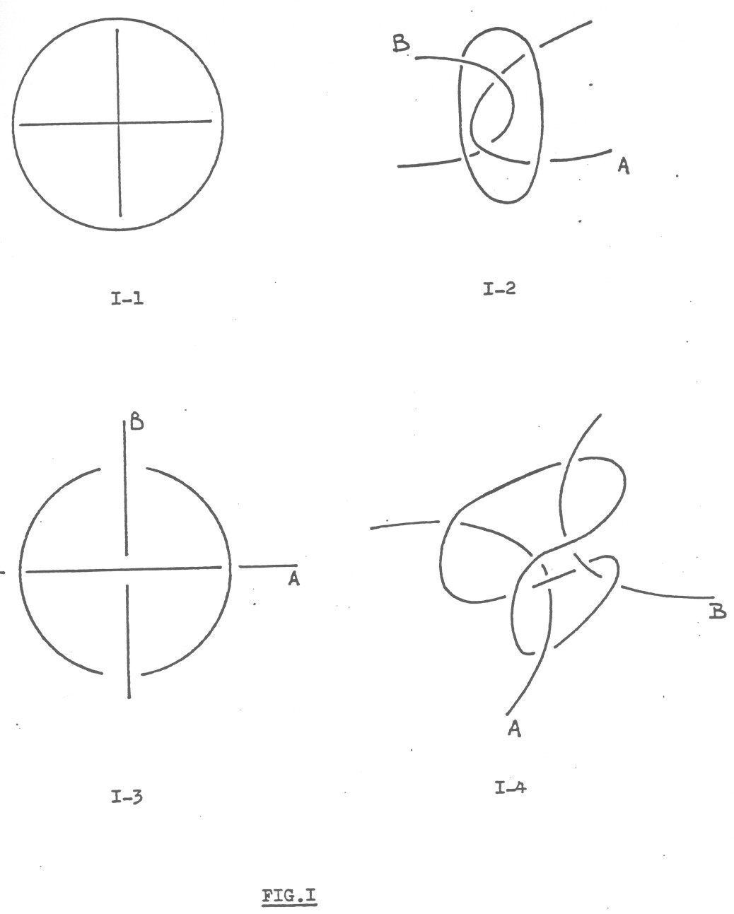 Essayez comme ça de vous y mettre. Quand vous voyez ça comme ça, qu'est-ce que vous en faites imaginairement ? Vous en faites deux choses qui se crochent, ce qui revient à les plier (Fig.I-2) ce A et ce B, à les plier de cette façon-là. Moyennant quoi, le cercle, le rond, le cycle, je reviendrai tout à l'heure sur ce que ça veut dire, n'a plus qu'à glisser sur ce qui est ainsi noué.