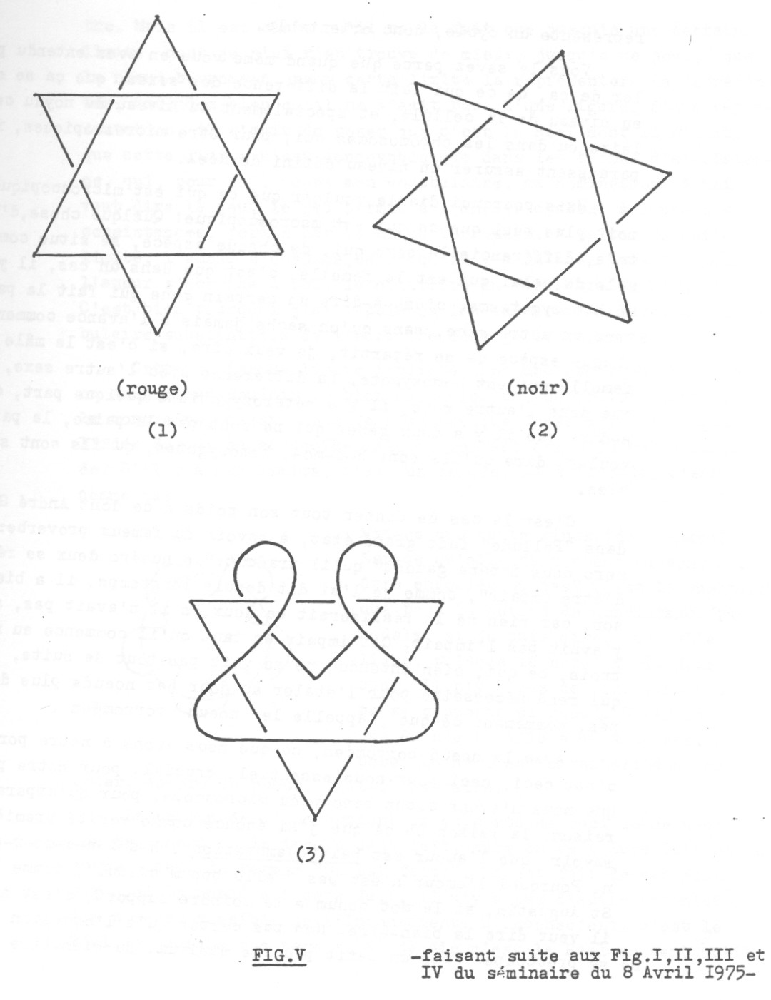 Mais pour en revenir, car je veux terminer sur quelque chose qui ait substance, est-ce que Freud n'a pas proprement énoncé que dans l'identification, il l'a dit, personne n'en voit le support, c'est-à-dire la portée, il n'y a d'amour que de l'identification portant sur ce quatrième terme, à savoir le Nom du Père. Est-ce qu'il n'est pas étrange que d'identification il nous en énonce que trois, et que dans ces trois, il y a tout ce qu'il faut pour lire mon noeud borroméen. C'est à savoir qu'il va jusqu'à désigner proprement la consistance comme telle, en tant que dans ce noeud, elle est partout. Que ça fasse trou ou pas, la consistance est la base à savoir , vous voyez, le triskel, à savoir ceci (fig.IV) par exemple, puisque je n'en ai que là l'exemple, le triskel qui n'est pas un noeud. Il ne s'inscrit que de la consistance, il a appelé ça le trait unaire. On ne pouvait pas mieux dire ce qui fait composante du noeud, non sans avoir mis en tête qu'il n'y a d'amour, je dirai, que de ce qui du Nom du Père fait boucle entre les trois, fait boucle des trois du triskel. Ce terme triskel, je pense que ça dit peut-être quelque chose à un certain nombre d'entre vous.