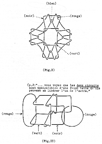 Il y a une autre façon de redoubler cette forme pliée, en somme, vous voyez que j'essaie de vous mettre au fait, cette forme pliée, cette forme liée qui, qui s'accroche l'une à l'autre il y a une autre façon qui consiste à user de ce que je vous ai déjà montré une fois, à l'occasion, à savoir de ceci (Fig. IV) à savoir de ceci, de ceci qui ne va pas sans constituer de soi un cercle fermé. Par contre, sous la forme suivante, vous voyez que (Fig. II) les deux circuits sont manipulables d'une façon telle qu'il peuvent se libérer l'un de l'autre. C'est même pour ça que les deux cercles, ici marqués en rouge, peuvent en constituer un noeud qui soit à proprement parler borroméen, c'est-à-dire qui, du fait de la section d'un quelconque, libère les deux autres.