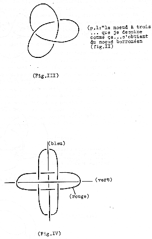 Dans la figure, une chaîne borroméenne, est-ce que il ne nous apparaît pas (Fig. IV ) que le minimum est toujours constitué par un noeud à quatre, je veux dire que c'est à tirer cette corde verte pour que vous vous aperceviez que le cercle noir, ici noué avec la corde rouge, sera en étant tiré par cette corde bleu, sera, manifestera la forme sensible d'une chaîne borroméenne. Il semble que le moins que l'on puisse attendre de cette chaîne borroméenne, c'est ce rapport de un à trois autres, et, si nous supposons, comme nous en avons là la preuve, si nous pensons effectivement qu'un noeud à trois car celui-là n'est pas moins un noeud à trois ( Fig. I ), que ces noeuds se composeront borroméennement l'un (p6->)avec l'autre, nous aurons, nous toucherons ceci que c'est toujours de trois supports que nous appellerons, en l'occasion, subjectifs c'est-à-dire personnels, qu'un quatrième prendra appui, et, si vous vous souvenez du mode sous lequel j'ai introduit ce quart élément, chacun des autres est supposé constituer (Fig. ci-centre)