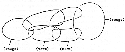 Voilà, l'autre jour, je vous ai dit que le noeud à trois, le noeud à trois que je dessine comme ça (Fig.III), et dont vous voyez qu'il s'obtient du noeud borroméen en rejoignant les cordes en ces trois point que je viens de marquer, je vous ai dit que le noeud à trois, j'avais fait la trouvaille qu'il se nouaient entre eux, à trois, borroméennement. Je vous ai dit aussi en quoi, si l'on peut dire, c'était tout à fait justifiable par une explication. Je vous ai dit que je m'étais efforcé pendant deux mois de faire ex-sister, pour ce noeud le plus simple, un noeud borroméen à quatre. Je vous ai dit également que le fait que je n'y étais pas arrivé à le faire ex-sister ne prouvait rien, sinon ma maladresse. Je crois, je suis même sûr, je m'en souviens, je crois vous avoir dit que je croyais qu'il devait ex-sister. J'ai eu, le soir même, la bonne surprise de voir surgir, il était tard je dirai même que j'étais sorti avec un peu de retard, vu mes devoirs, j'ai donc vu surgir sur le pas de ma porte le nommé TOME (Tomé ) pour le nommer, et qui venait m'apporter, et je l'en ai grandement remercier, qui venait m'apporter, fruit de sa collaboration avec SOURY - SOURY et TOME, souvenez-vous de ces noms - qui venait m'apporter le preuve, la preuve que le noeud borroméen à quatre, de quatre noeuds à trois, ex-siste bien. Ce qui justifie assurément mon obstination, mais ce qui n'en rend pas moins déplorable mon incapacité. Je n'ai néanmoins pas accueilli la nouvelle que ce problème était résolu avec des sentiments mélangés, mélangés de mon regret de mon impuissance avec celui du succès obtenu. Mes sentiments ne l'étaient pas. Ils étaient simplement d'enthousiasme, et je crois leur avoir montré quelque chose, quand je les ai (p2->) vus, quelque soir après, et soir où, d'ailleurs, ils n'ont pas pu me rendre compte comment ils l'avaient trouvé. Il l'avaient trouvé de fait, et j'espère n'avoir pas fait d'erreur en transcrivant, car ce n'est qu'une transcription, en transcrivant comme je l'ai fait sur ce papier central le fruit de leur trouvaille. (Fig.V) , il paraît bien clair que les trois autres noeuds à trois sont libres. Il est bien clair, en effet, que le noeud à trois vert est sous le noeud à trois rouge, qu'il suffit ce noeud à trois vert, de le sortir du rouge, pour que le noeud à trois brun, ici, se montre également libre.