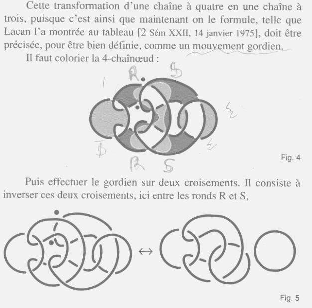 | 2-la structure de la perversion, c'est le sinthome quaternaire. Nous sommes ramenés à l'involution du noeud entre chaîne à quatre ronds et chaîne à trois. La chaîne borroméenne généralisée définie cette topologie N.ACp252 | ![]() |