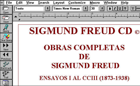 Por primera vez en su computadora, Ud. tiene el TEXTO COMPLETO de la Obra de Sigmund Freud, en su versión castellana, junto a Folio Views©, la más potente herramienta de consulta.