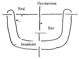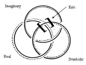 (...) If you know a little about what a Borromean knot is, then I will indicate the following : that if the ego is there, we shall see the strict restitution of the Borromean knot in this way: here is the Real; here the Imaginary; here the unconscious and the ego of Joyce. You can easily see on this Bo knot that the interception by the ego liberates the Imaginary relation.73